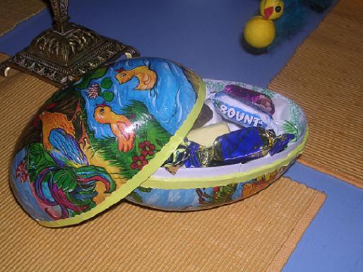 הקינוח, לעומת זאת, היה שבדי מסורתי לפסחא. כל פסחא קונים הורים לילדים מן ביצים ריקות מקושטות בציורי אפרוחים וציפורים ומה לא, וממלאים אותם בשוקולדים. אצלנו במשפחה אין ילדים, אבל הבנזוג לא התבגר מעולם, אז זה גם הולך. וכך הוגשה ביצת פסחא לשולחן: