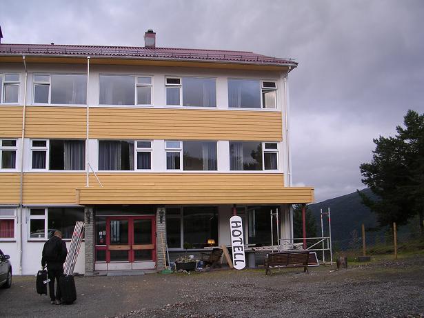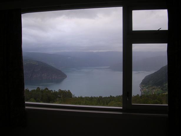 לינה: החלטנו על ספונטניות. רואים מקום נחמד? מחפשים מלון ועוצרים בו. עבד כמו קסם. לקראת ערב היום הראשון עצרנו בוויק, עיירה קטנה על תחילת פיורד, ומצאנו פונדק שמשכיר שם חדרים, הכל בנוי מעץ, פשוט אבל מאוד חמים ונעים. בלילה השני, לעומת זאת, החלטנו ללכת על נוף. בראש הר מצאנו מלון, שממבט ראשון נראה סגור לשיפוצים. נכנסנו ושאלנו, והתברר שזה שייך לנורבגית ולבעלה הפקיסטני. הפקיסטני הזעיף פנים עת רווית ודימה אמרו שאנחנו מישראל, אבל אשתו חייכה ואמרה שאין בעיה, אנחנו יכולים לישון שם. למרות המראה החזיתי של הבניין, שעדיין בשיפוצים, הנוף מחלון החדר היה משהו שפשוט קשה לתאר. הנה שתי תמונות, האחת של המלון מקדימה, והשנייה של הנוף הנשקף מהחדר.
