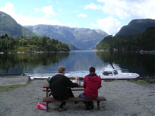 האוכל: מראש ידענו שאין מה לצפות בשטח הגסטרונומי. גם כל המדריכים שקראנו הזהירו לא לבנות ציפיות. רוית, דימה ואני החלטנו לדבוק ברעיון אחד: נורבגיה מפורסמת בדגי הסלמון שלה? יפה, אנחנו נאכל פה רק סלמון. שלושה ימים אכלנו רק סלמון. וזה היה, אני חייבת להודות, הסלמון הכי טעים שאכלתי אי פעם, וזה לא משנה אם אכלתי אותו בארוחה במסעדה שווה או במזנון דרכים. הם יודעים איך לעשות את הסלמון שלהם, הנורבגים האלה. הבנזוג, שאינו אוכל דגים, התקיים על שקיות תפוצ'יפס ושוקולד. חוץ מזה עשינו פיקניקים. כל פינה שלא תעצרו שם היא פינה עוצרת נשימה. כך למשל בתמונה הבאה, שהיה פיקניק לא מתוכנן, פשוט עצרנו לאכול בשולחן הראשון שראינו, ובמקרה זה היה נוף עוצר נשימה…