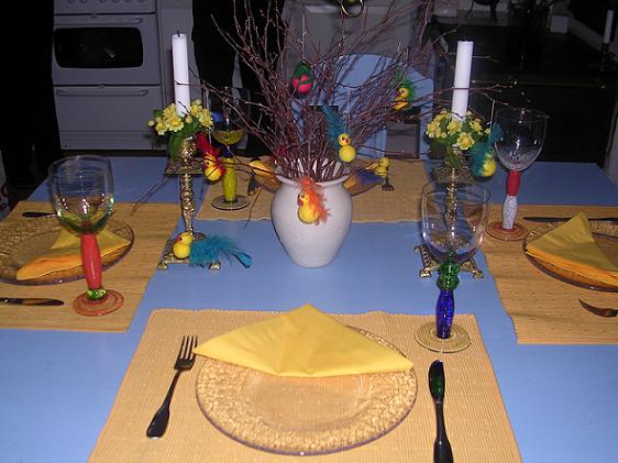 קישוטי הפסחא. הרעיון פשוט. לוקחים כמה ענפים, מדביקים עליהם נוצות צבעוניות, ומציבים בחצר. אין בית בלי נוצות. גם בשולחן החג: