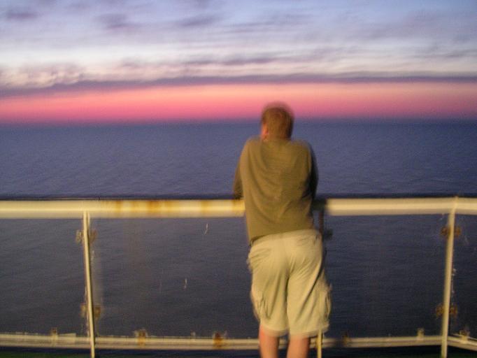 ולקינוח, תמונת סיום. מצד אחד שקיעה, ים, מקסים. מצד שני, מעקה הסיפון, כמו שאתם רואים, הוא הג'יפה האופייני לספינה. לא סתם כיבסנו את כל מה שהיה איתנו באונייה.
