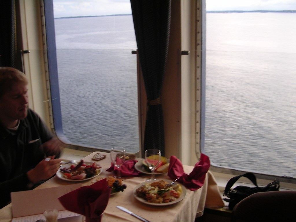 אז הבנזוג כאמור היה מאוד לא מרוצה. גם אני לא. כי מהר מאוד גיליתי שהבופה הזו, שיותר מכל הזכיר לי אוכל של עלייה לתורה בבר מצווה באייטיז, הורכב מהדגים האלה: סלמון מעושן קר, סלמון מעושן חם, הרינג מעושן קר, הרינג מעושן חם, והרינג במגוון גירסאות מעושנות. אני מחזיקה בדעה ששום דבר לא צריך להיות מעושן אלא אם כן הוא חציל. מיותר לומר שלא מצאתי מה לאכול. הדבר הטוב היחיד הוא שקיבלנו שולחן מעולה, ליד החלון. אחרי שלקחנו צלחת עם טעימות וגילינו ששום דבר לא טעים לנו, החלטנו פשוט לשבת שם ולא לזוז.
