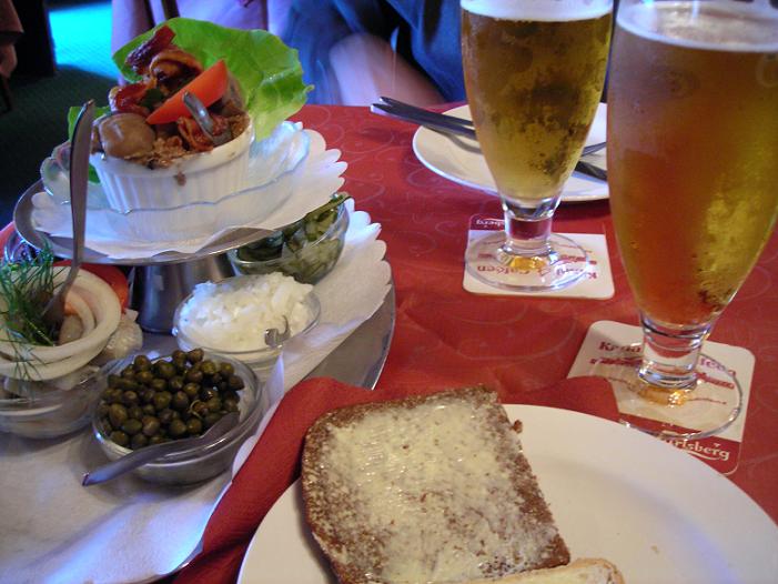 השבדי בחן את התפריט שלי בקינאה, משום שמתברר שהמסעדה לא טרחה להכין תפריט בשבדית, אלא מייעדת לשבדים תפריטים בדנית. השבדי דווקא הבין כל מילה בתפריט שקיבל, אבל קיווה שהוא טועה, בגלל שהרוב היה דגים. הוא לא טעה, וכך, בשעה 12 בצהריים (שקול לשעת ארוחת בוקר מוקדמת במושגים שלנו), הזמנתי אני סנדוויץ' הרינג קלאסי, והשבדי הזמין סנדוויץ' ממרח כבד. בשביל להוריד את האוכל הקליל הזה הזמין כל אחד מאיתנו בירה, הראשונה בשורה ארוכה של בירות שנשתה במהלך היום הזה.
