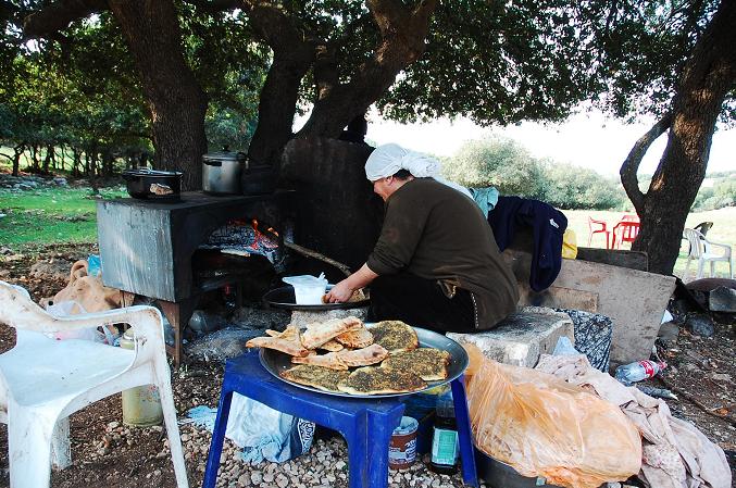 בדרך לדליית כבר פיתחתי תיאבון, ולכן בכל פעם שחלפנו על פני דוכן דרכים שאמר "פיתה דרוזית חמה עם לבנה" משכתי בכנף מעילו של האופנוען. למרבה הצער הוא לא הבין בכלל את הרמז. רק על גג המנזר שאלתי איך זה שהוא לא רעב, והוא ענה שדווקא כן, אבל חשב שכל דוכני הדרכים האלה לא מספיק מפונפנים בשבילי ולכן לא עצר. סליחה?? נעלבתי. בתגובה הדגים לי האופנוען מה דימיין שאשאל לו נעצור לאכול בדוכן דרוזי: