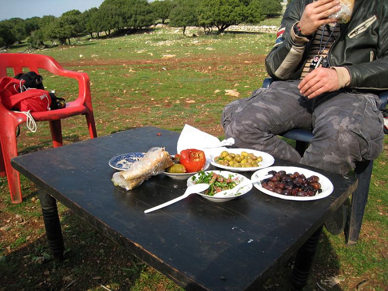 תפסנו שולחן שבאמת יושב באמצע שום מקום, בין פרות משוטטות לטבע, נרגענו, הזמנו שתי פיתות עם לבנה, ולשולחן התחילו לזרום דברים: זיתים ירוקים, זיתים שחורים, צלחת ממולאים (עלי גפן, קישוא ופלפל) וקערית טבולה. וגם תה לקינוח.
