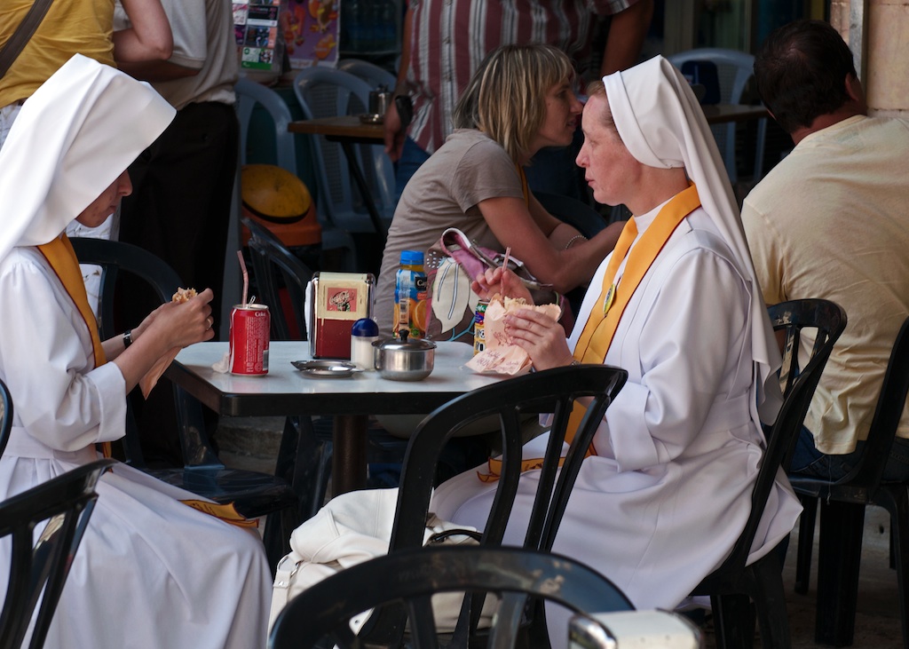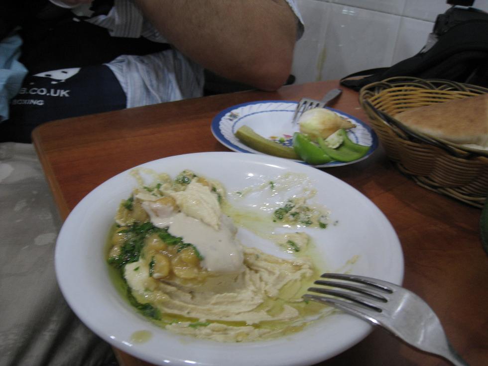 קצת משוקשקים מהחוויה הזו יצאנו לחפש את החומוס. השוטר שעמד בכנסייה אמר לנו "לינא? מה פתאום, החומוס הכי טוב בעולם זה אבו שוקרי, ובכלל, לינא סגור ביום ראשון". אז בעקבות ההוראות שלו יצאנו לחפש את אבו שוקרי. בדרך שאלנו ילד שמכר כל מיני מאכלים איפה אבו שוקרי. הילד אמר: "אבו שוקרי? מה פתאום, החומוס הכי טעים בעולם זה מוראד". אז בעקבות ההוראות שלו יצאנו לחפש את מוראד. כששאלנו מוכר בשוק איפה זה מוראד, הוא ענה לנו: "מוראד? מה פתאום, החומוס הכי טעים בעולם זה נאזים". בשלב הזה כבר די טעינו בסימטאות השוק, ובייחוד התעצבנו כששאלנו את הבן אדם הבא, שענה: "נאזים? מה פתאום, החומוס הכי טעים בעולם זה לינא". בקיצור, חזרנו להתחלה. הוא גם טען שלינא פתוח, זה אבו שוקרי שסגור ביום ראשון. אבא ואמא חרקו שיניים והחליטו למצוא את המקומות בכוחות עצמם. התברר שגם לינא וגם אבו שוקרי פתוחים ביום ראשון, והגענו קודם ללינא.