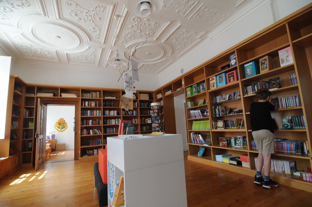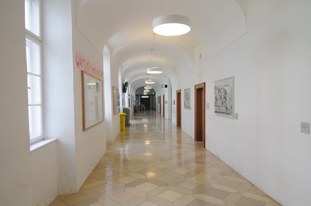 כל הדלתות כאן מובילות למה שהיו חדרי השינה. החדרים האלה הם היום חדרי כיתות וספרייה, כלומר הם שופצו והשתנו לגמרי, אבל עדיין יכולתי להתרשם מגודלם, מהחלונות שבהם, שצפו אל הגן הירוק. איזה הבדל זה היה בוודאי מול החדרים הצפופים במחנות.